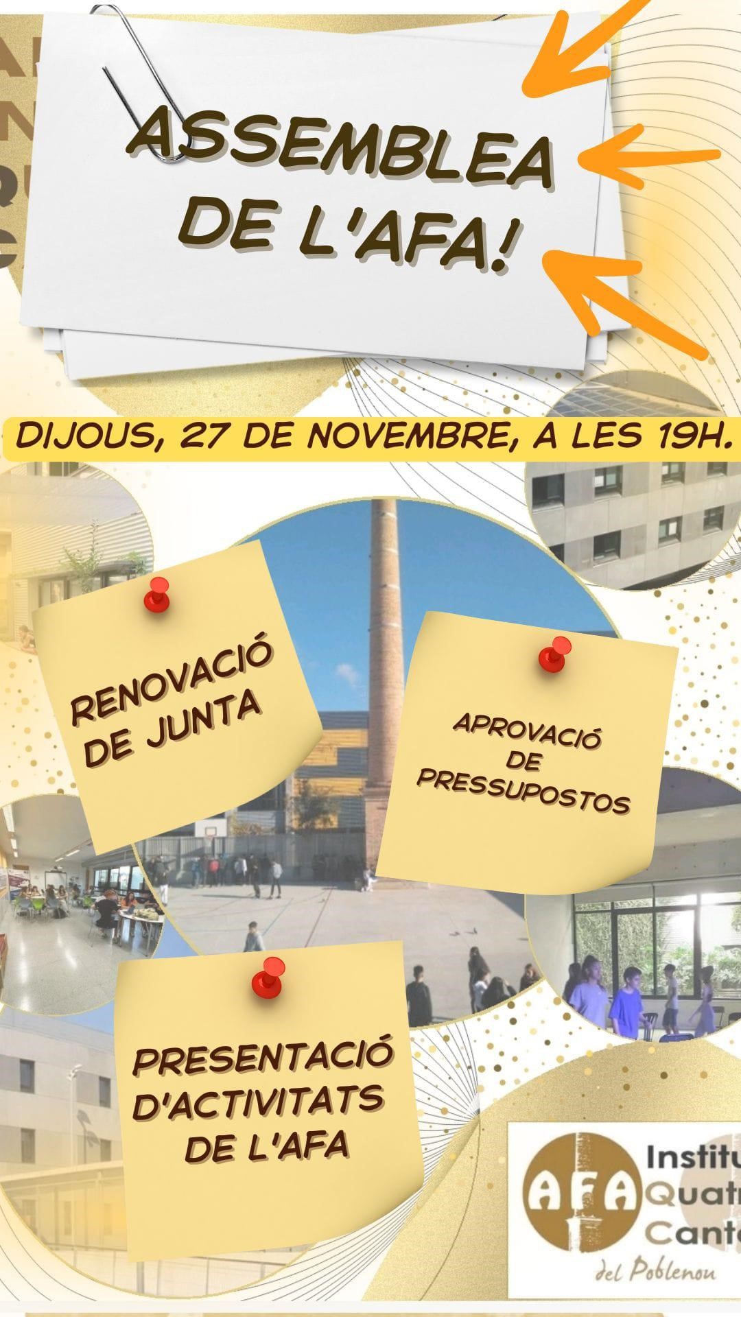 Assemblea de l’AFA: 27 de novembre a les 19h Posted by AFA4Cantons | nov. 7, 2025 | AFA, Viu l'Afa | 0 | Vine a la l’Assemblea i participa a l’AFA! T’esperem! Si vols presentar la teva candidatura a la Junta, a una comissió concreta o tens dubtes al respecte, escriu a afa@4cantons.cat.